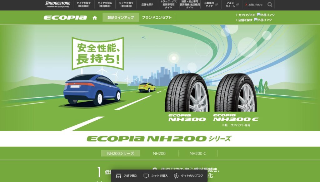 エコピア NH200は、「新車装着タイヤと同等性能」と「安全性能の長持ち」をテーマに開発されたブリヂストンのスタンダードタイヤです。こだわりの設計により、新車の基準レベルを満たしつつタイヤがすり減っても雨の日の安全性が低下しにくい構造を採用しています。